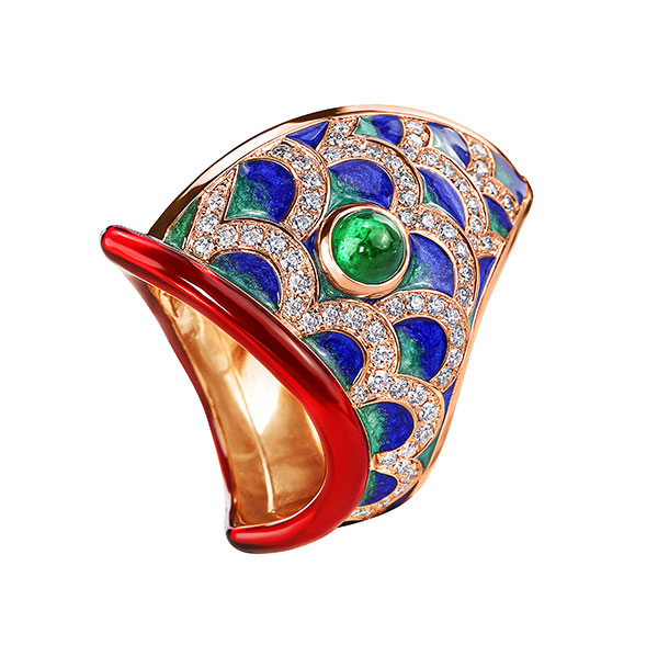 Το δαχτυλίδι Lucky You της Jacob & Co., κατασκευασμένο από 18 καράτια ροζ χρυσό και με στρογγυλά σμαράγδια καμποσόν. Επίσης λευκά διαμάντια και μπλε, πράσινο και κόκκινο σμάλτο. Φοριέται από τη Naomi Watts στη νέα σειρά All’s Fair του Hulu.